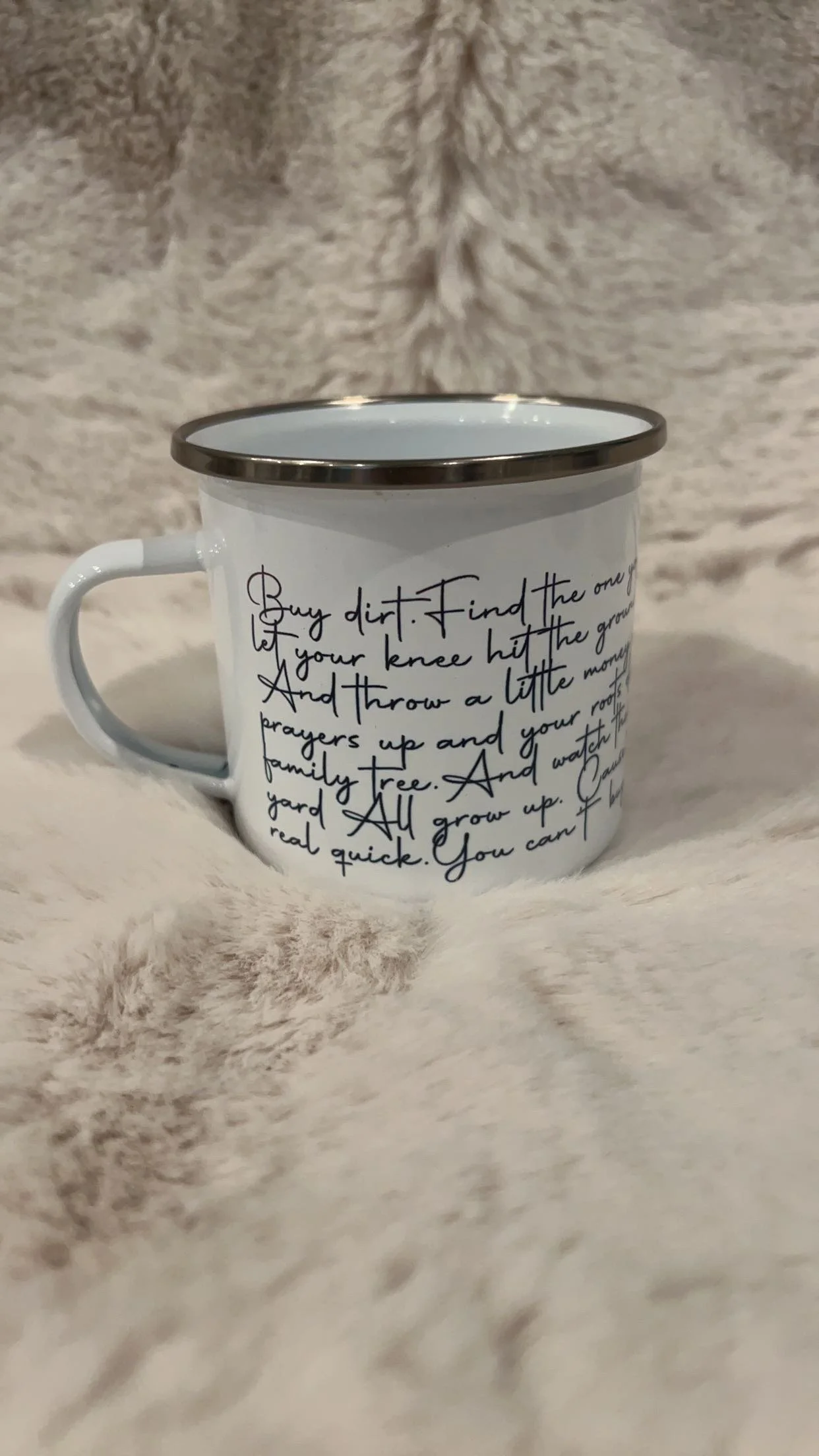Shop All › “Buy Dirt” Lyrics Metal Mug “Buy Dirt” Lyrics Metal Mug $14.00 Sold Out 12oz coffee mug. Enamel coated metal mug, featuring the lyrics in script to the hit song by Jordan Davis “Buy Dirt”. 12oz coffee mug. Enamel coated metal mug, featuring the lyrics in script to the hit song by Jordan Davis “Buy Dirt”. Sold Out Added!