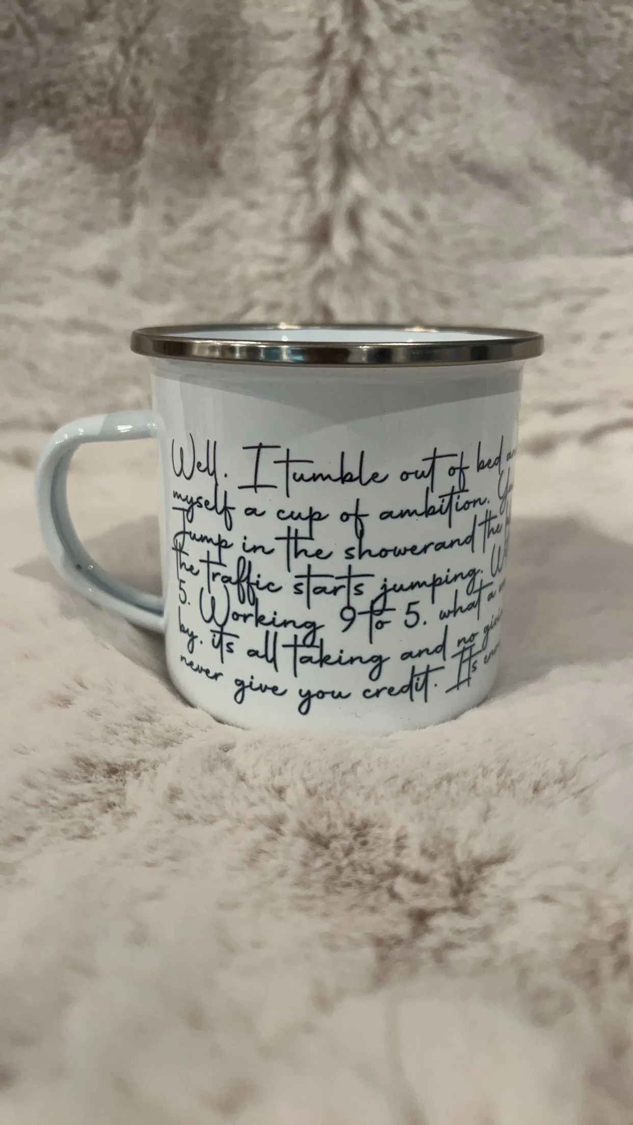 Shop All › Dolly “9 to 5” Lyrics Metal Mug Dolly “9 to 5” Lyrics Metal Mug $14.00 12oz coffee mug. Enamel coated metal mug, features the lyrics to Dolly Parton’s hit song “9 To 5”. 12oz coffee mug. Enamel coated metal mug, features the lyrics to Dolly Parton’s hit song “9 To 5”. Add To Cart Added!